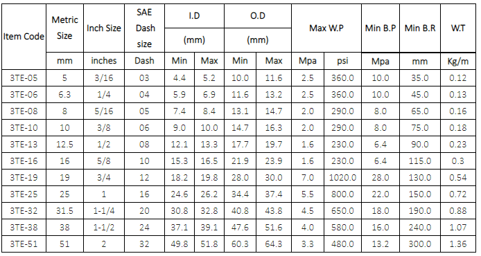 EN 854 3TE textile reinforced hydraulic hose is suitable for delivering petroleum-based hydraulic fluids and it is mainly used for medium pressure applications. It is composed of three parts: tube, reinforcement and cover. The tube is made from high quality oil resistant synthetic rubber, making the hose widely used for delivering petroleum-based hydraulic oils. The reinforcement is made from two layers of braided textile, making the hose lightweight and have excellent flexibility. What’s more, the hose is easy to operate. The cover is made from high quality black oil, weather, abrasion and corrosion synthetic rubber, making the hose have wide application and long service life.